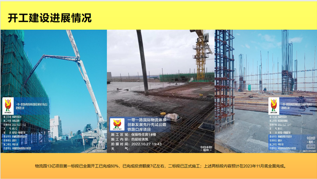 目前“一帶一路”國際物流體系創(chuàng)新發(fā)展先行先試公路鐵路口岸建設(shè)項(xiàng)目州發(fā)改委項(xiàng)目備案、招投標(biāo)工作、取得施工圖審查合格證書、參建各方合同簽訂等前置手續(xù)已完善,人才公寓、冷鏈庫、鐵路堆場(chǎng)等項(xiàng)目正在施工,預(yù)計(jì)2024年底完成施工并投入使用。